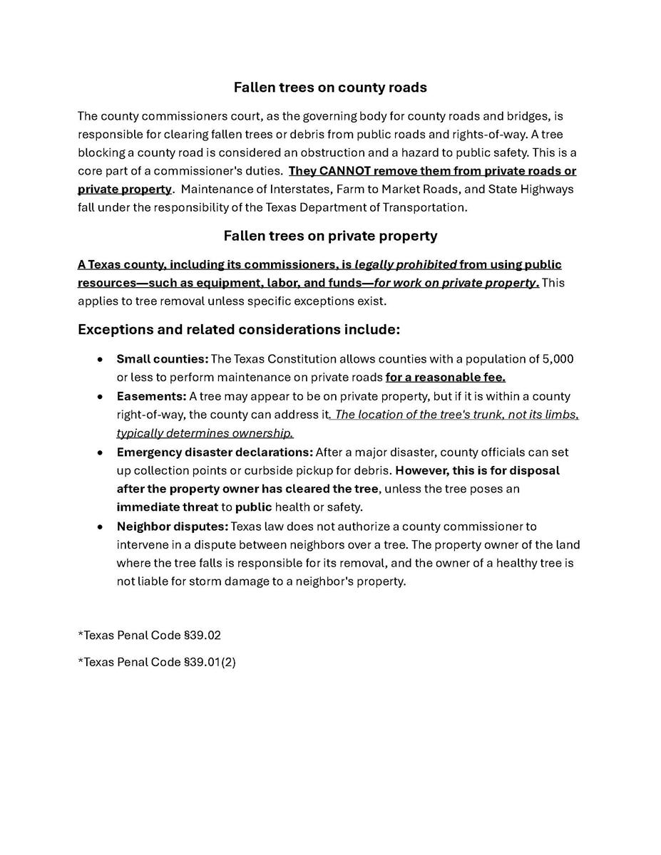 "I would like to take a moment to thank my fellow Commissioner, Kerry McCoy of Prec. 2, and his men, David McFarland and David Moore for stepping up and lending a hand putting in a bus turn-around on CR 2104 when our crew was shorthanded. "